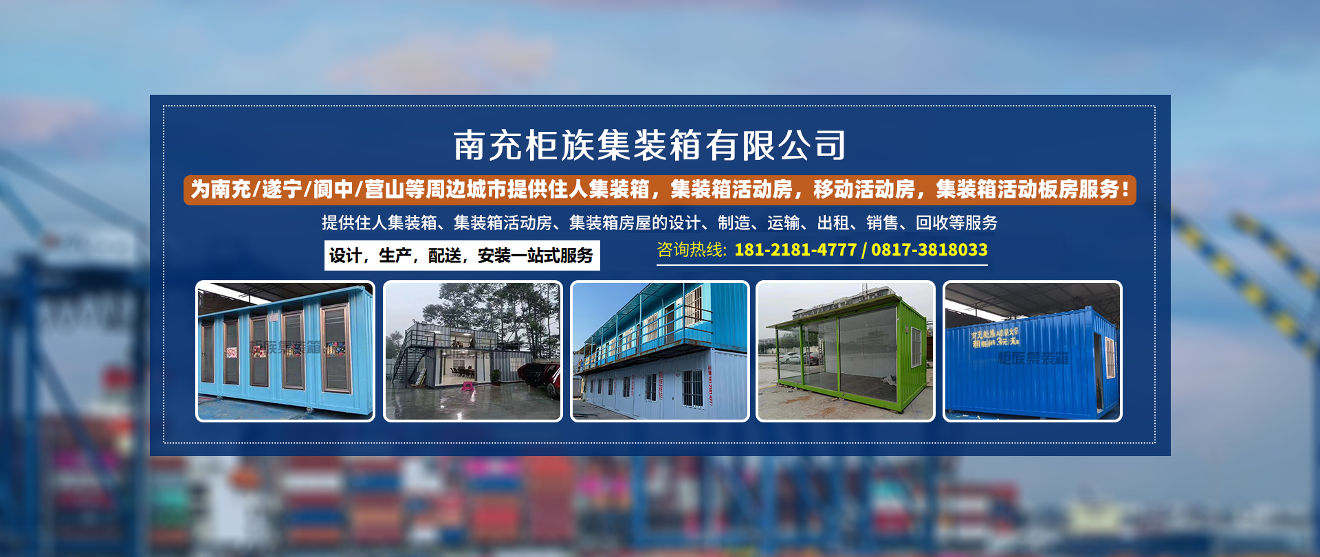 南充柜族集裝箱有限公司是一家為南充/遂寧/閬中/營山/蓬安/南部/西充等周邊城市提供住人集裝箱,集裝箱活動房,移動活動房,集裝箱活動板房服務!本公司專業(yè)服務南充住人集裝箱、南充移動活動房、南...